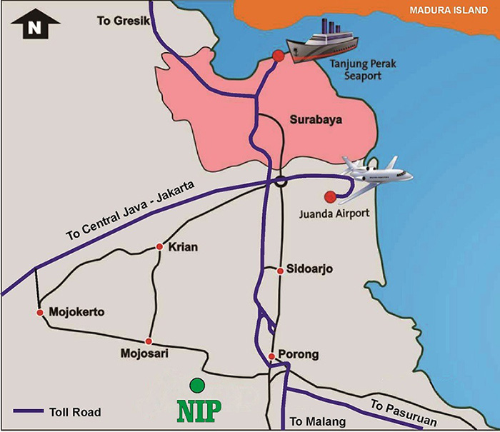 Ngoro Industrial Park is located 45 km south of Surabaya city. Tanjung Perak seaport (50 km), Juanda airport (50 km) and the city can be reached through toll road within 1 hour drive.